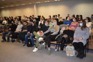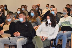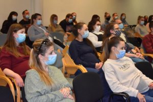 A második foglalkozás kiemelt témája volt a szülőszoba bemutatása. Bár az intézményünkben érvényben lévő korlátozások miatt a kismamák és kispapák ezúttal csak virtuálisan, egy videó segítségével léphettek be a szülőszobába, Zsoldos Erika szülésznő minden részletre kiterjedő filmjéből és kiegészítő magyarázatából részletesen megismerhették a szülészetet, sőt az apukák számára is tartott külön előadást, az ő szerepükről és az apás szülés „feladatairól”.