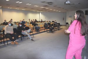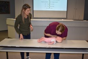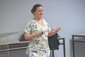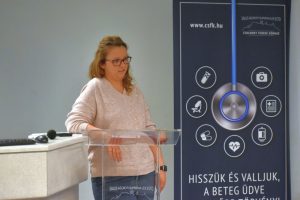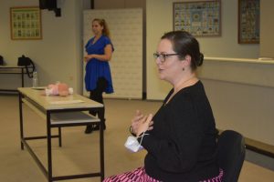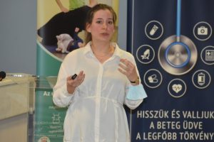 Csarmasz Dóra védőnő az újszülött osztály tevékenységéről és a rooming-in jelentőségéről beszélt a tanfolyam résztvevőinek, kiemelve, kórházunkban az újszülött a nap 24 órájában édesanyjával lehet.