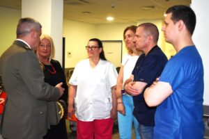 Az olasz kontingens tagjai látogatást tettek a Sürgősségi Betegellátó Osztályon és a Traumatológiai Ambulancián is. Itt dr. Németh Balázs, az SBO osztályvezető főorvosa és Schnitter Ivett főnővér, a Traumatológia részéről pedig dr. Meszes Ferenc szakorvos és Reitnerné Tóth Erzsébet asszisztens üdvözölte az olasz vendégeket. Tulisi alezredes köszönetét fejezte ki kollégáink számára a színvonalas ellátásért és elkötelezett gyógyító munkáért.